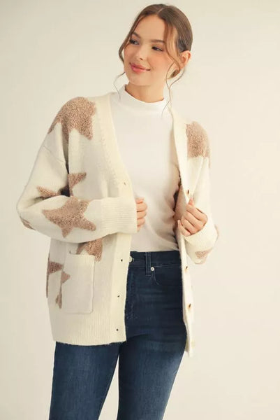Drop shoulder front button down sherpa star sweater cardigan, star textured, fluffy star, pockets.